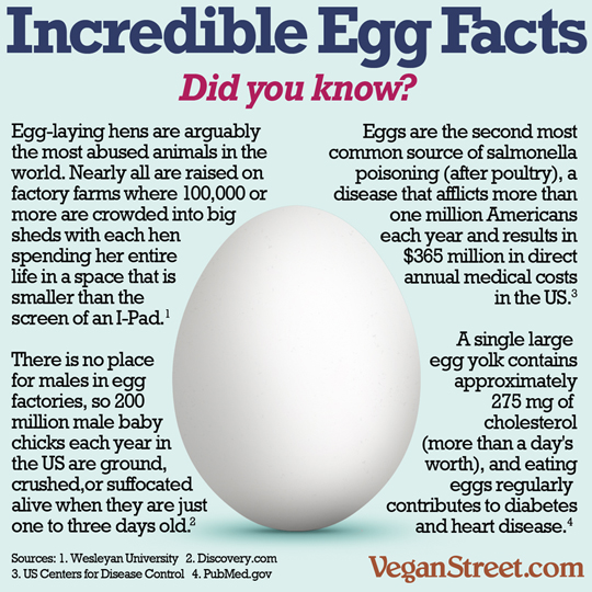 I'm sad to say, +Chicken Little, that eggs are much more suffering laden than you realize. The horrors start at hatching, with all the males being disposed of, and usually in torturous ways (e.g. being ground alive for use in chicken nuggets, or being electrocuted, or even thrown in the garbage with the bag tied shut to slowly suffocate to death under the weight of his siblings).