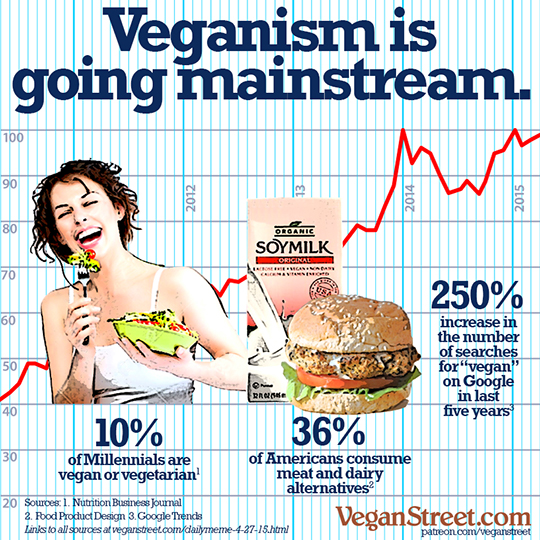 "Vegan restaurants, cafes and stores are popping up all over my city and around the world. More vegan substitutes are available than ever before. Animal rights awareness is growing rapidly. Mainstream media is starting to promote veganism."