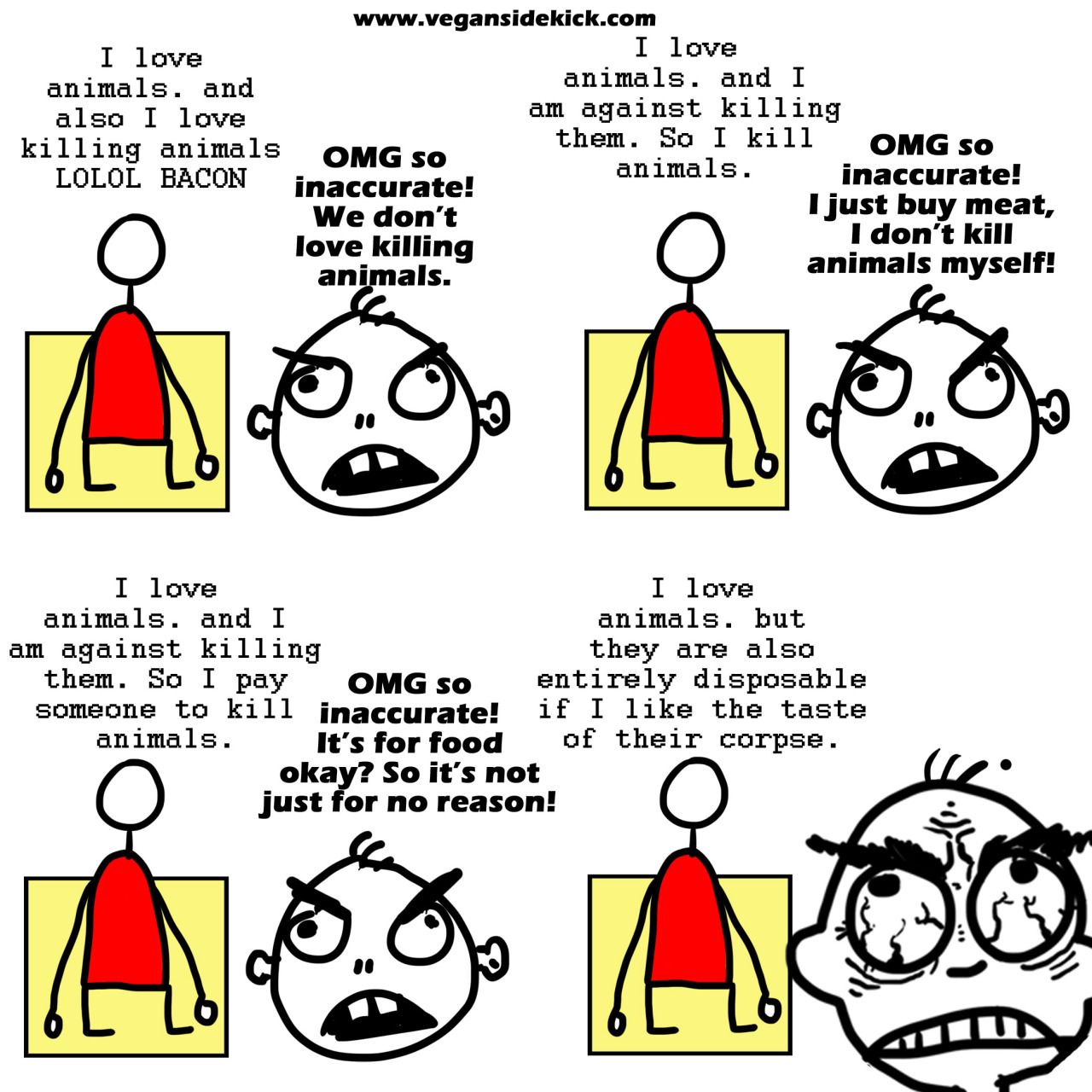 I do understand that there are some people out there who genuinely love animals and still eat meat. These people are different in the sense that they haven't yet made the connection (between meat and animal suffering), but eventually will. After all, most vegans have eaten meat at some stage in their life. I'm one of them - I didn't make the connection between meat and animal suffering until I was six years old. As a true animal lover, I immediately cut out meat for good after my "big realisation". The amount of time it takes for somebody to break free of the meat-eating mould is often largely dependent on their upbringing. Some people have been brought up to believe that meat-eating is completely necessary for good health, so I can understand why it may take them a little longer to break free.