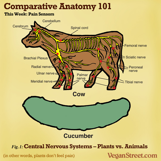 Now imagine this scenario. You have a gorgeous garden in your backyard. You decide that you’d like to make a pasta primavera for dinner, so you head outside to select some vegetables. Walking toward your garden, bucket in hand, you reach down and begin picking tomatoes, zucchini, basil, and perhaps even some lettuce for a salad. Do the vegetables writhe in pain in your bucket? Did they struggle and attempt to get away from your hand as you went to pick each item? Obviously the answer to this question is “no,” and it probably made you chuckle a bit at the thought of vegetables feeling pain or fear. Vegetables don’t have brains. They don’t have nervous systems. Therefore, harvesting vegetables is quite different than raising and slaughtering animals for food.